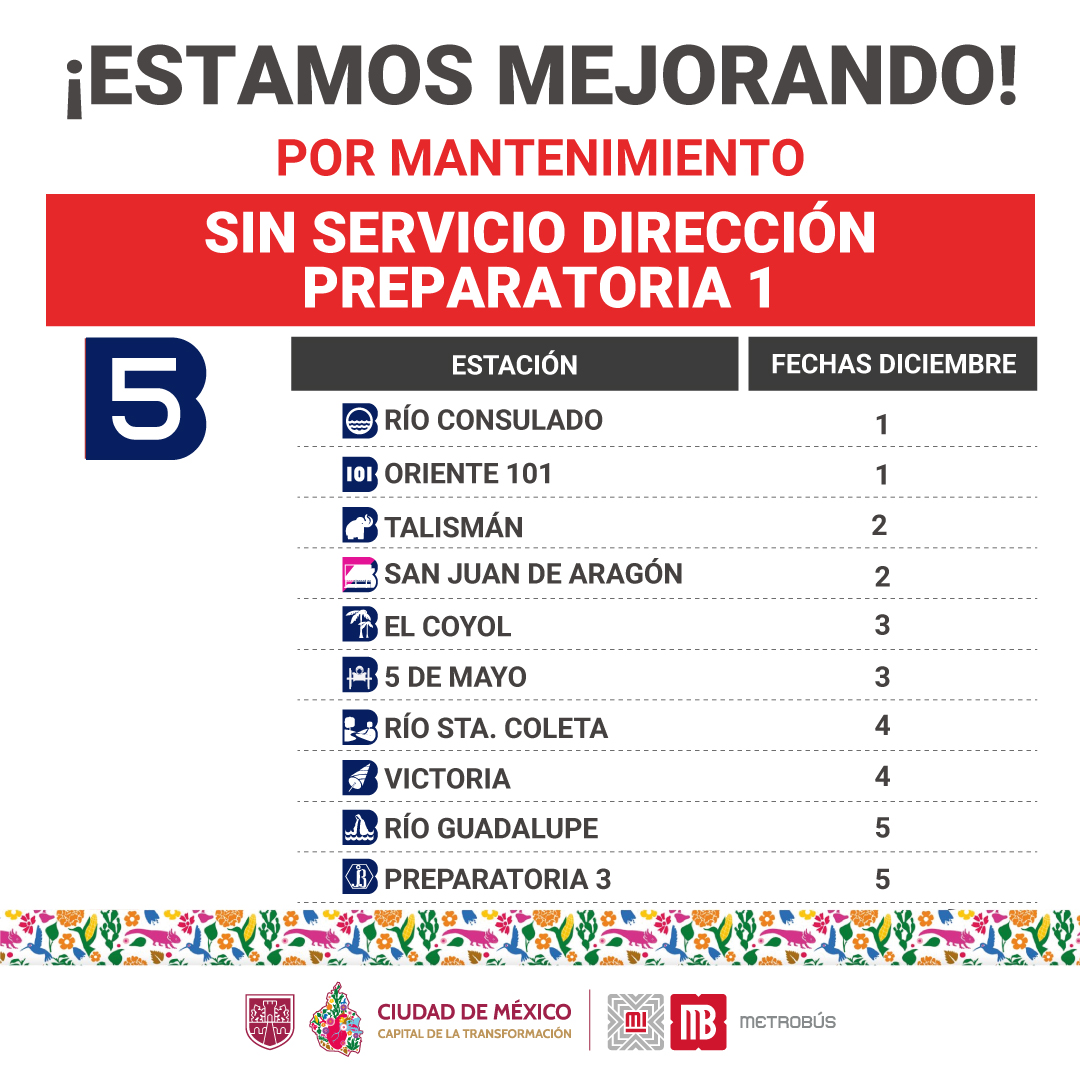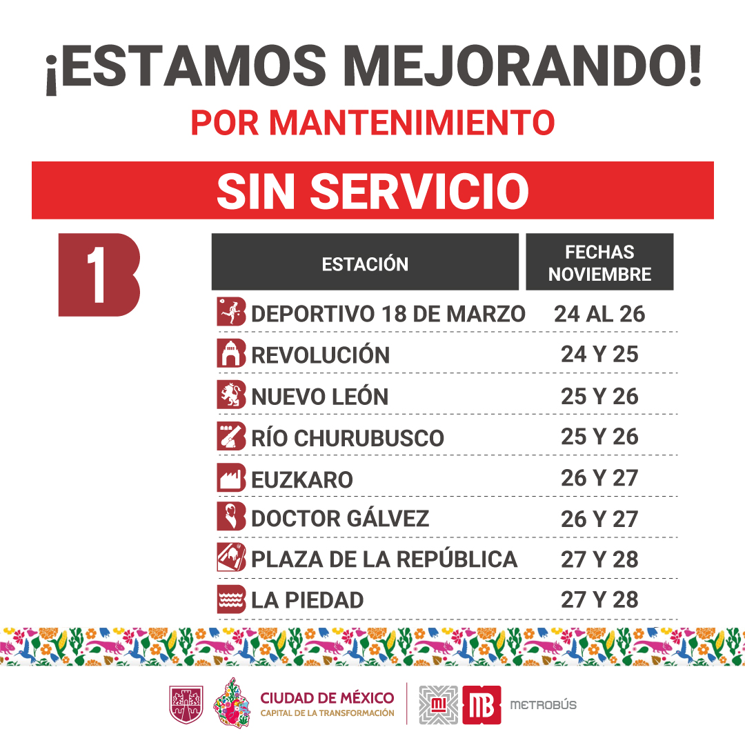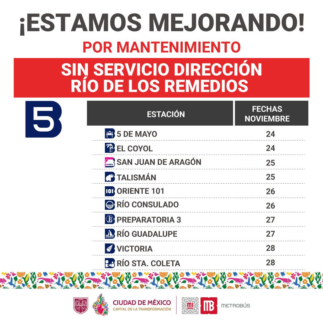 Como parte de las mejoras periódicas al sistema, Metrobús anuncia que del 24 de noviembre al 5 de diciembre se llevarán a cabo trabajos de mantenimiento mayor en estaciones de las líneas 1, 2 y 5 para adecuar los espacios en beneficio de las personas usuarias.